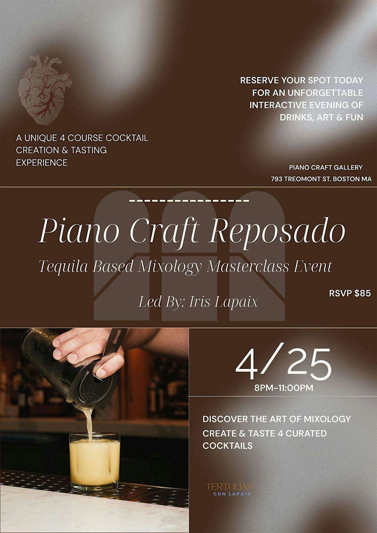 Come join us for an unforgettable night of drinks art and fun at the Piano Craft Gallery! Get ready for this hands on mixology and cocktail creation experience. You will be guided through the creation of 4 tequila based signature drinks inspired by the art in the gallery curated by Tertulias Con Lapaix. All drinks, materials, and supplies included in price. See you there!