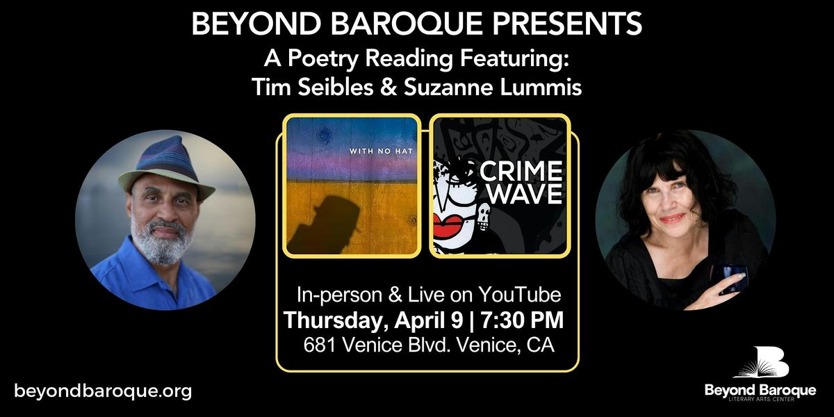 Join us for a reading with poets Tim Seibles and Suzanne Lummis. Visiting from Virginia, Seibles reads from With No Hat, a new collection that reflects the range and evolution of his long career. He is joined by Lummis, a central figure in poem noir, whose latest book, Crime Wave, moves through crime, desire, and power with style and precision. A chance to hear two renowned poets whose work continues to shape the literary field nationwide!