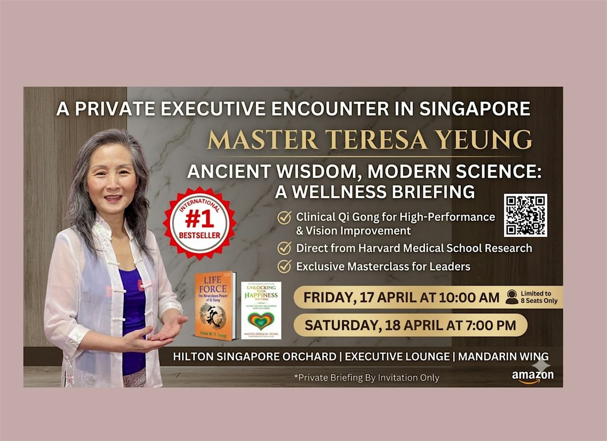 Fresh from sharing her research at the Osher Center for Integrative Medicine (Harvard Medical School and Brigham and Women's Hospital) on Tai Chi and Qi Gong as a "Whole Person Health" approach, Master Teresa wishes to meet with like-minded wellness leaders and visionaries in Singapore. This is not a formal seminar, but a heart-to-heart encounter to share ancient wisdom and explore the science of the "Life Force."