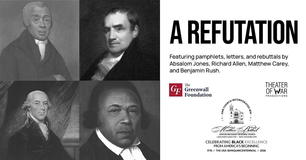 These special presentations of A REFUTATION will take place at Mother Bethel AME Church, the oldest African Methodist Episcopal church in the nation, founded by Richard Allen in 1794 and the home of his resting place.