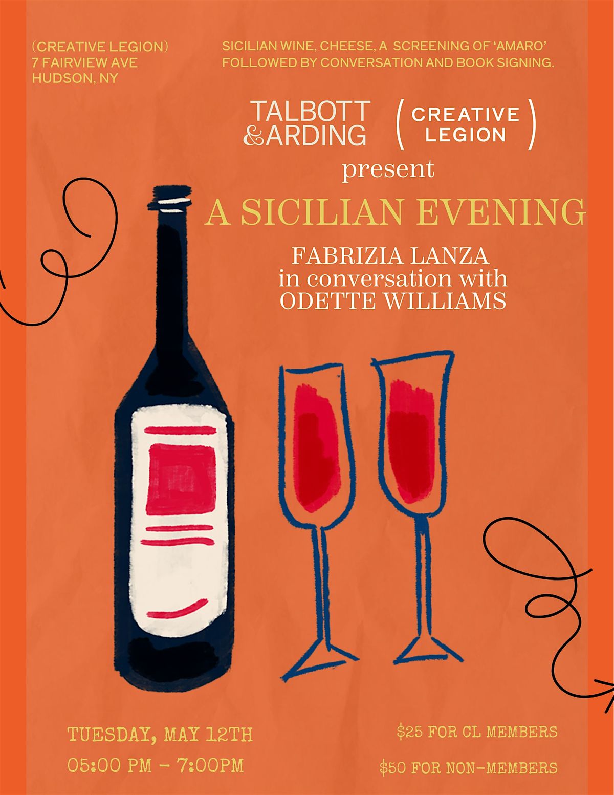 The evening concludes with a reception featuring Sicilian cheeses and accompaniments curated by Talbott & Arding, along with a book signing. Seats are limited.
