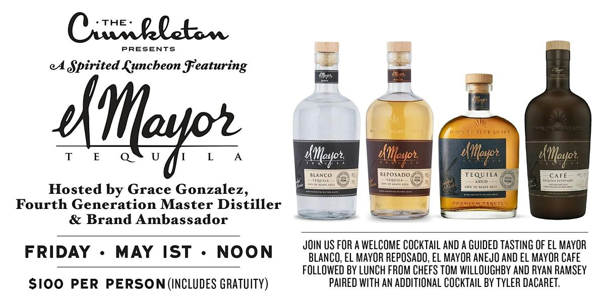 Join us for A Spirited Luncheon with El Mayor. Start your afternoon off with a welcome cocktail, followed by a guided El Mayor tasting led by Grace Gonzales, Fourth Generation Master Distiller & Brand Ambassador. Finally, enjoy a wonderful lunch prepared by Chefs Tom Willoughby & Ryan Ramsey, paired with an aditional cocktail by Tyler Dacaret.