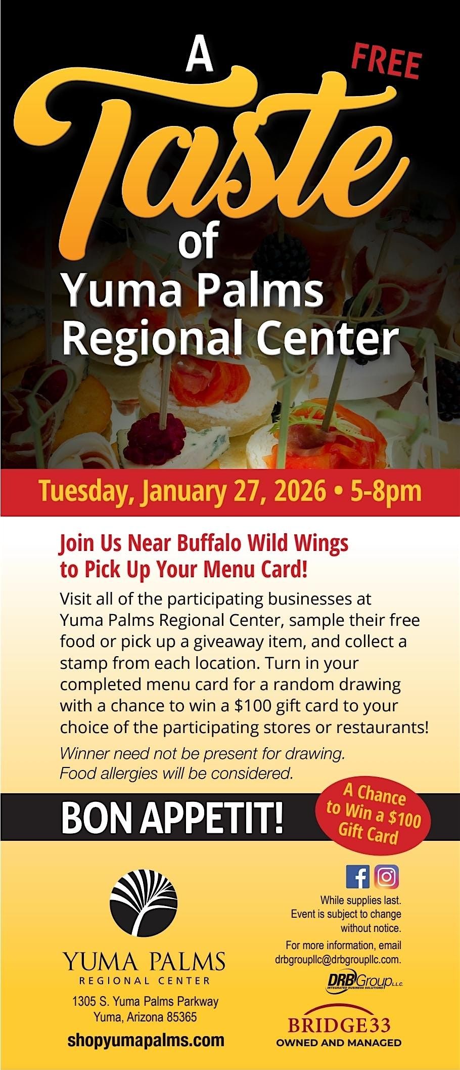 Join us and see what The Yuma Palms Regional Center has to offer! Pick up your menu card near Buffalo Wild Wings and sample free food and beverages, or pick up a giveaway item, from participating businesses in the center. Receive a stamp from each participating location as well to complete your menu card. Turn in your completed menu card for a chance to win a $100 gift card to your choice of the participating stores or restaurants!*