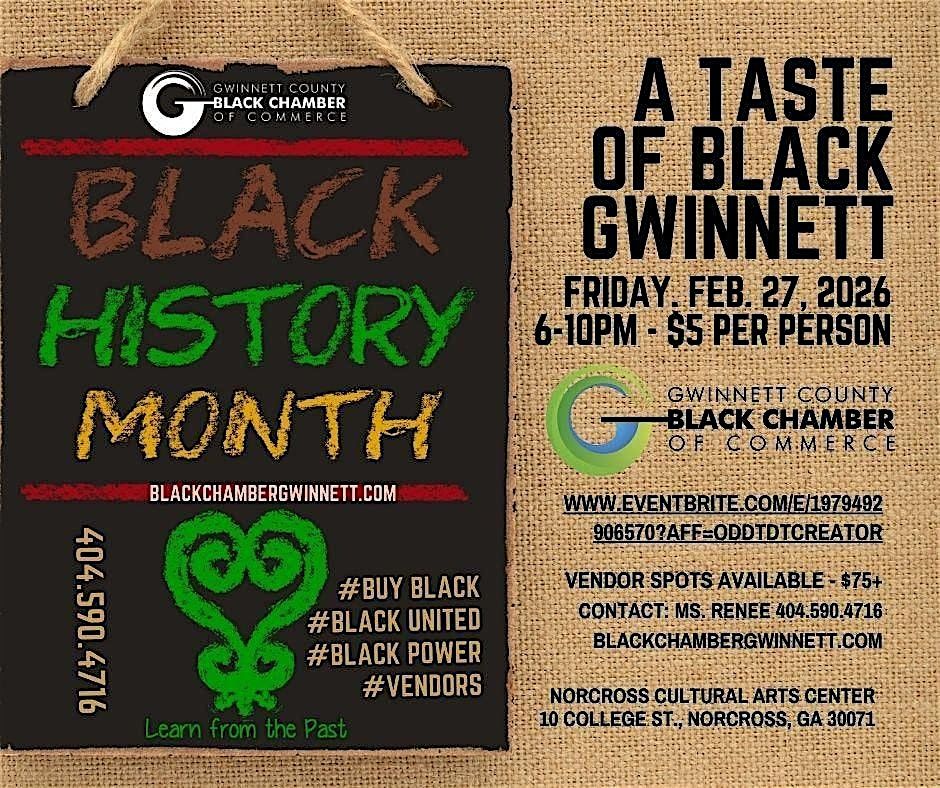 Join the Gwinnett County Black Chamber of Commerce (GCBCC) for "A Taste of Black Gwinnett - Black History Edition. 2026." This event is open to the public. Family-friendly.