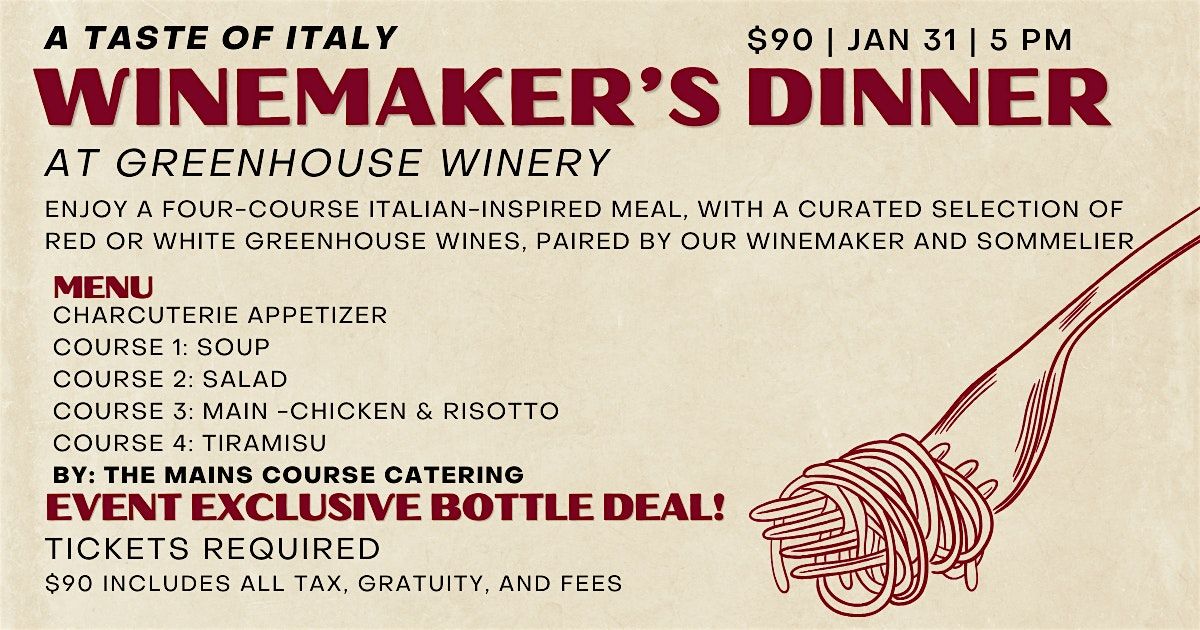 Join us at Greenhouse Winery for Winemakers Dinner: A Taste of Italy on January 31 at 5 PM—a two-hour, ticketed culinary experience celebrating Italian-inspired cuisine and perfectly paired wines. Enjoy a four-course dinner by The Mains Course Catering, guided by our Winemaker, Nicholas Hoffer, and Sommelier, Erin May, with your choice of red or white wine pairings. From charcuterie and salad to chicken & Risotto entrée and dessert, each course is thoughtfully matched with a Greenhouse wine, plus access to an event-exclusive bottle deal. Tickets are $90 per person and include all tax, gratuity, and fees. Seats are limited—advance tickets required.