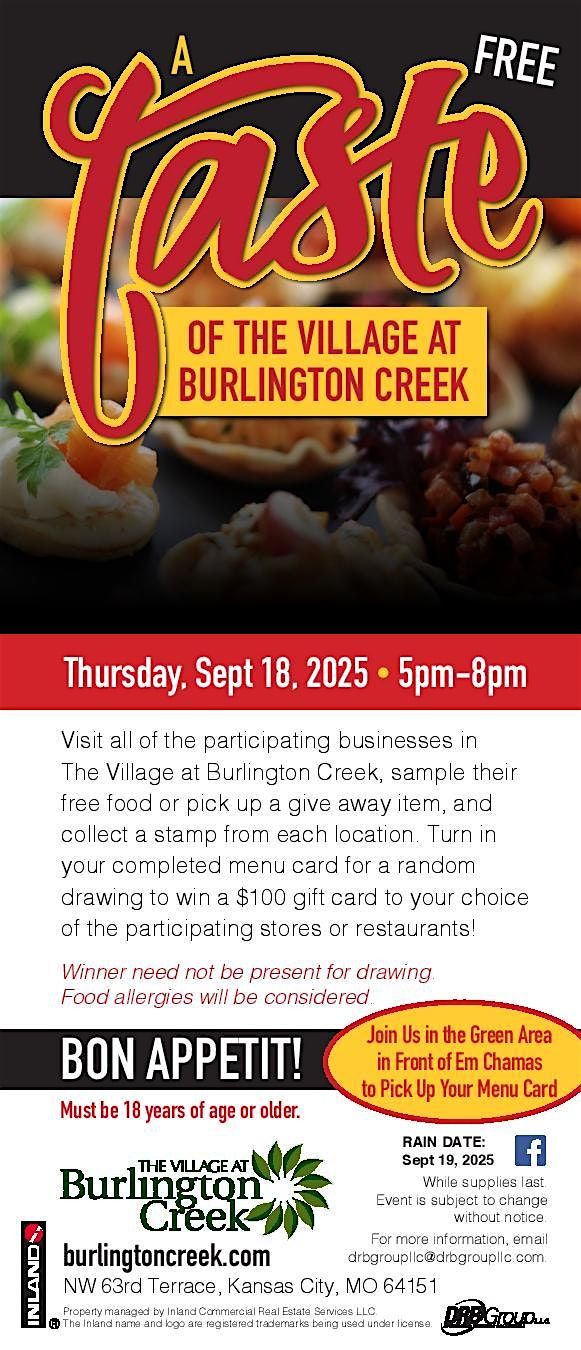 A Taste of The Village at Burlington Creek event is happening in the center on Thursday, September 18th, from 5pm-8pm!