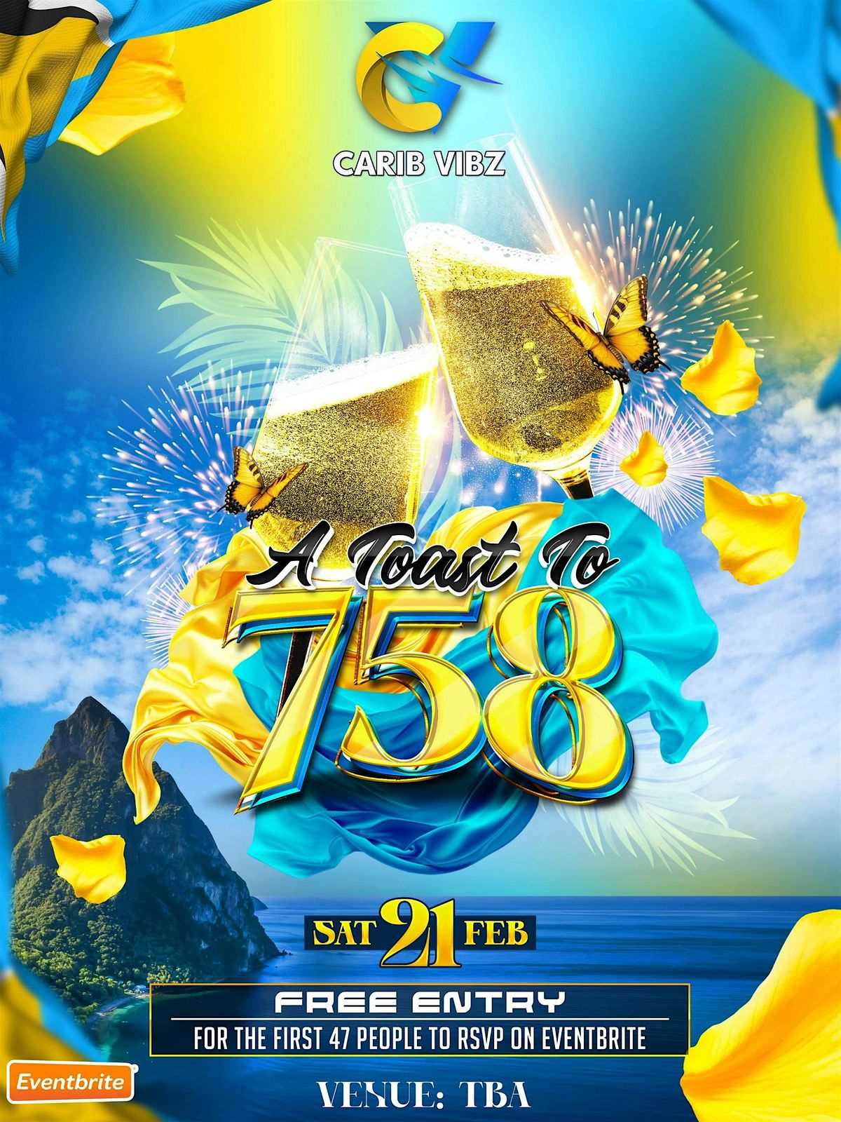 Doors open at 9:00 PM. The first 47 guests to RSVP on Eventbrite will receive free entry, so don’t wait. Tickets go live January 22 at 8:00 AM. More details coming soon—secure your spot and come celebrate 758 with us in style 🇱🇨🥂