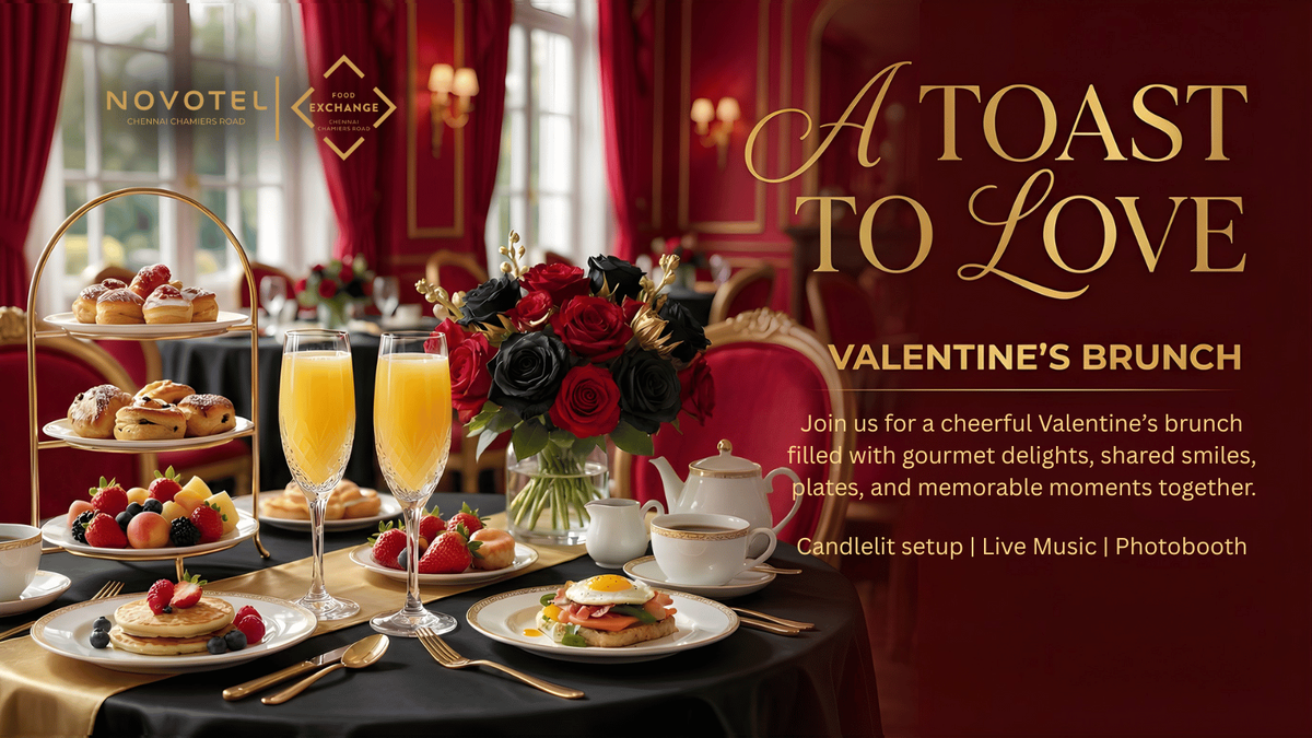 Raise a glass to love at A Toast to Love, an indulgent Valentineβs Brunch at Food Exchange. Thoughtfully curated for couples and loved ones, this elegant brunch brings together gourmet flavours, heartfelt conversations, and a setting straight out of a romance.Step into a beautifully candle-lit ambience, enjoy a lavish spread of brunch classics and sweet treats, and let live music set the mood for a leisurely afternoon. Capture picture-perfect moments at the photobooth and savour the joy of being together over good food and great company.Because love deserves to be celebrated slowly, deliciously, and in style. ππ₯