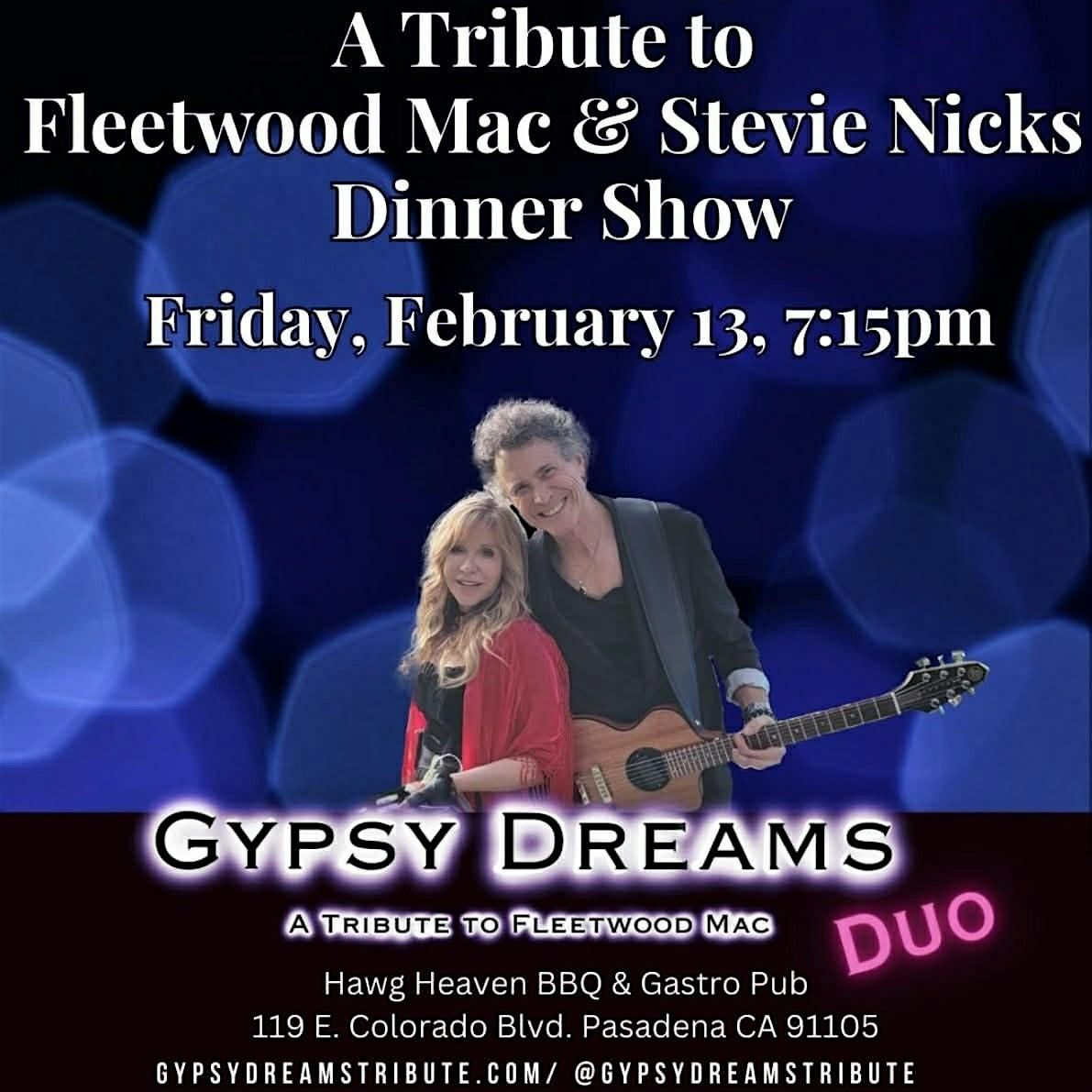 Step into a night of rock royalty as The Gypsy Dreams Duo brings the iconic sounds of Stevie Nicks and Fleetwood Mac to life. This soulful tribute blends unforgettable live music with a delicious two-course dinner, creating a warm, vibrant experience for fans of all ages. Whether you're a lifelong devotee or just discovering the magic, you'll be swept away by the timeless hits and captivating atmosphere. Bring the family, enjoy a great meal, and relive the classics that defined a generation.