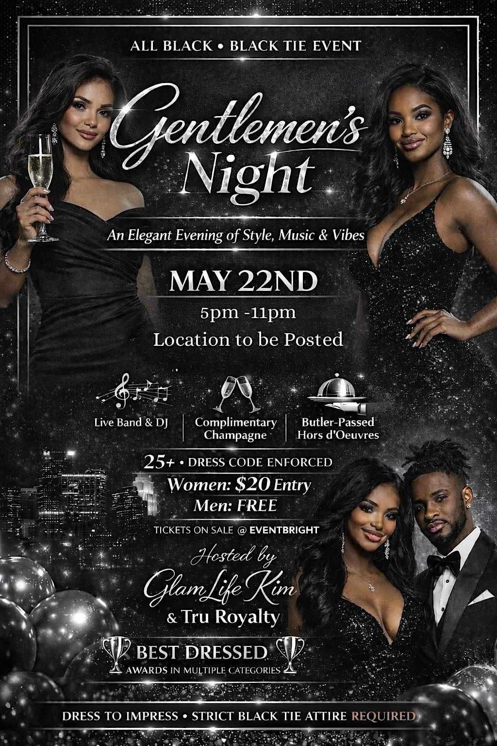 All Black Black Tie Gentlemen's Night, Women come in your best, $20 entrance, and men are free. May 22nd at 5 pm til 11 pm, live band/DJ, complimentary champagne, butler-pass hors d’oeuvres, cash bar, hosted by Tru Royalty & Glam Life Kim, with a few Surprise guests. Secret location to be posted