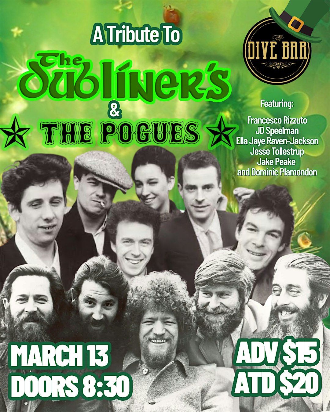 Get ready for an amazing night! Come listen to the amazing music of The Dubliners and The Pogues. Featuring Francesco Rizzuto, JD Speelman, Ella Jaye Raven-Jackson, Jesse Tollestrup, Jake Peake and Dominc Plamondon.