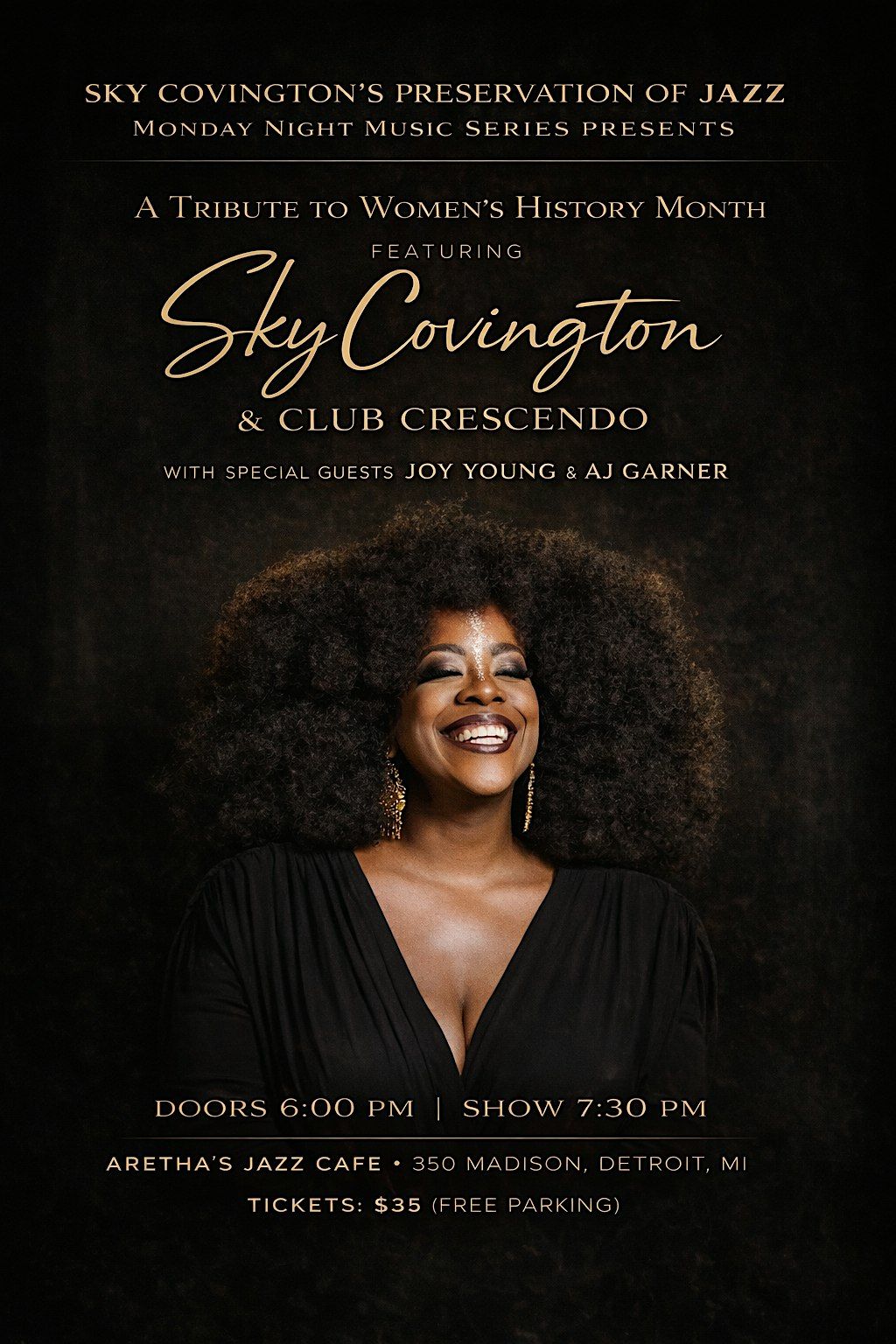 Detroit, MI — In honor of Women’s History Month, award-winning vocalist and cultural curator Sky Covington presents a powerful evening celebrating the strength, brilliance, and musical legacy of women.