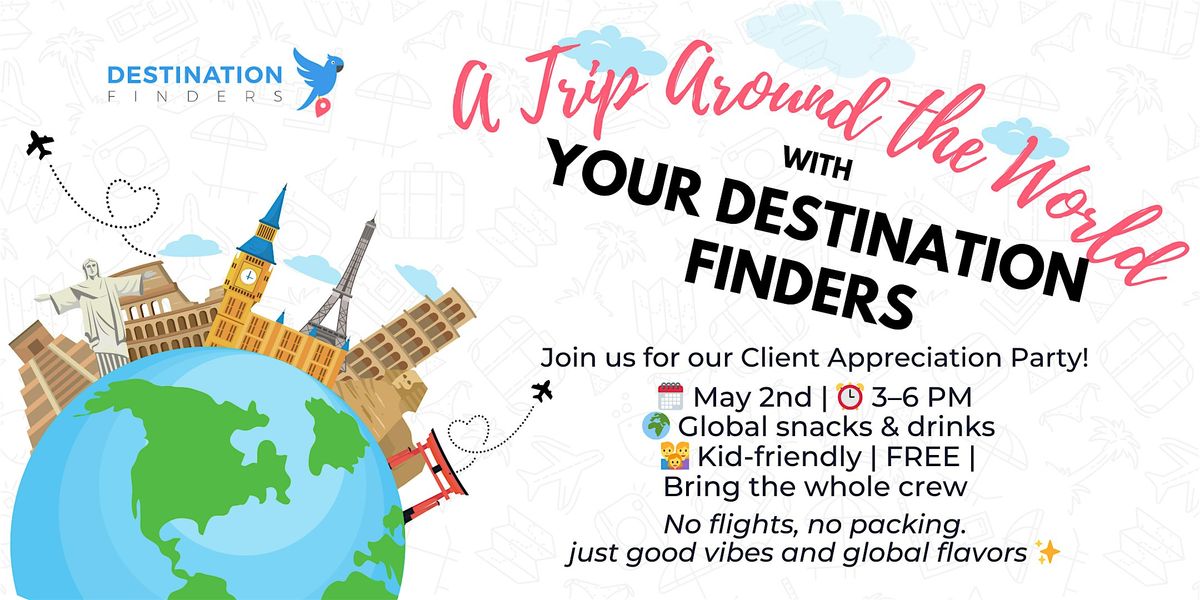You’re invited to Your Destination Finders’ Client Appreciation Party—and this year, we’re taking you on a trip around the world!