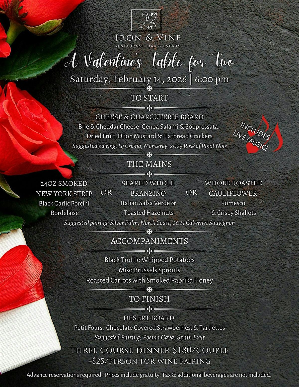$180 per couple (three course dinner & music) +$25 per person for wine pairing