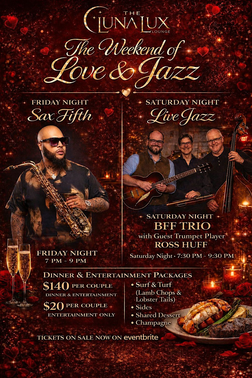 ✨ The Weekend of Love & Jazz at LunaLux Lounge Live jazz, Surf & Turf, shared dessert & champagne. Tickets on Eventbrite!