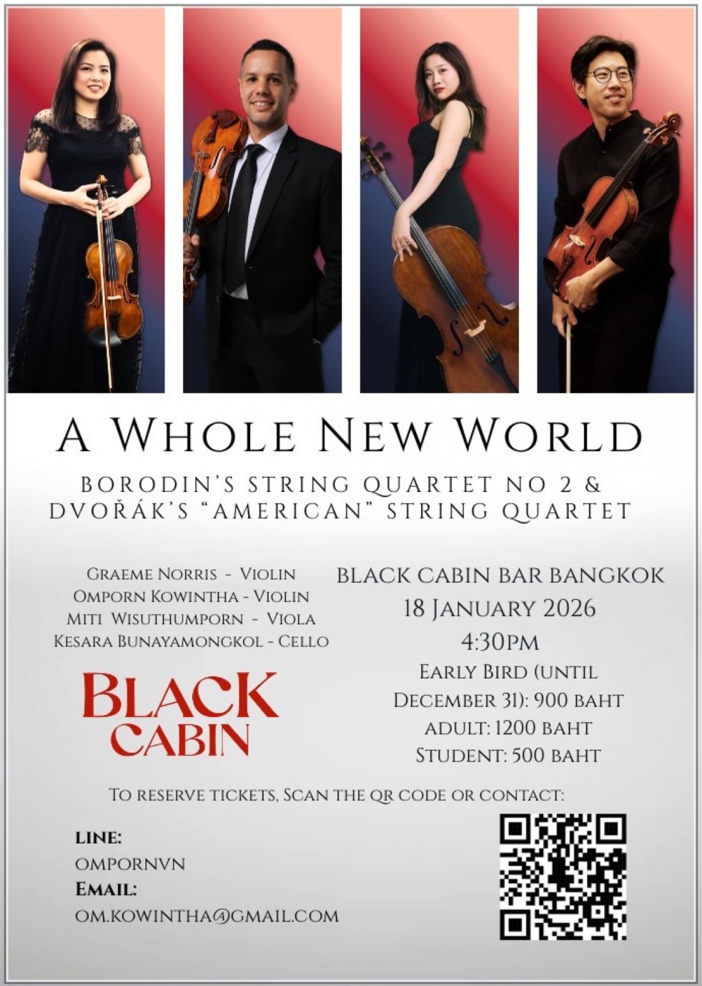 Join “Om and Friends” on Sunday 18th January, 4:30pm, at Black Cabin Bar for two of the most popular string quartets in the repertoire, Borodin's 2nd Quartet and Dvorak's "American" Quartet. Reserve your ticket today!