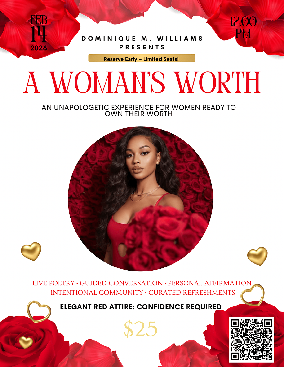 This Valentine’s Day, you’re invited to a bold, intimate, 3-hour daytime experience designed for women who are ready to stop questioning their value and start moving through life with clarity, conviction, and self-trust.