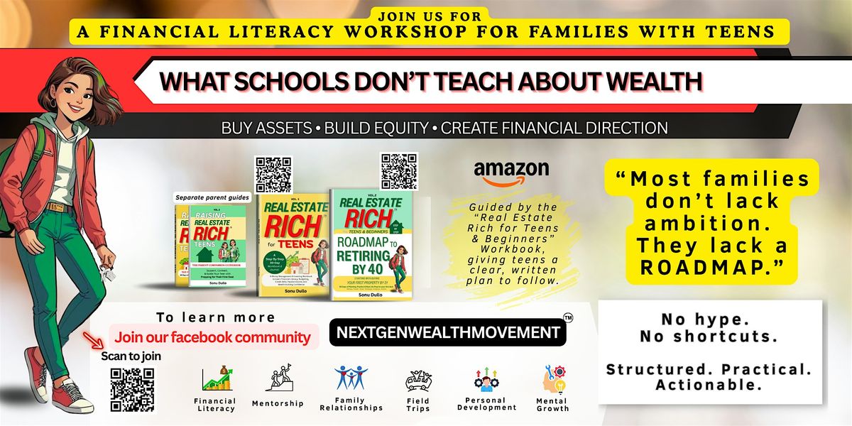 is designed for parents and teens who want to understand how money, and real-world opportunities actually work.This interactive session introduces families to practical financial knowledge, including credit, budgeting, real estate concepts, and how wealth is truly built over time.