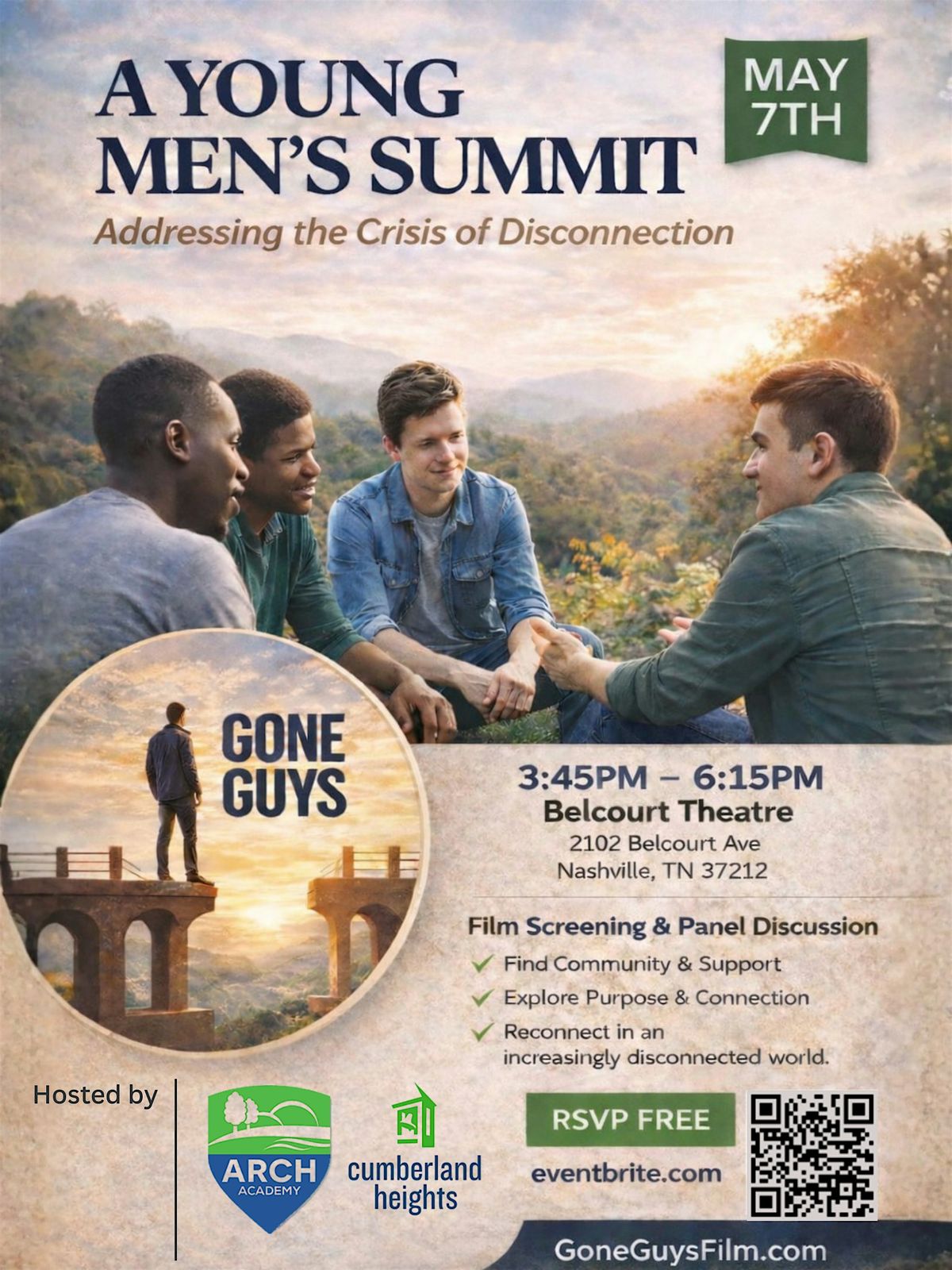 Across the country — and here in Nashville — boys and young men are experiencing increasing levels of isolation, disengagement, and emotional distress. A Young Men’s Summit: Addressing the Crisis of Disconnection brings our community together to confront this growing challenge and build stronger systems of support for our sons. Featuring a screening of Gone Guys and a live panel of young adults, clinicians, educators, and suicide prevention leaders, the summit will move beyond awareness to meaningful local action.