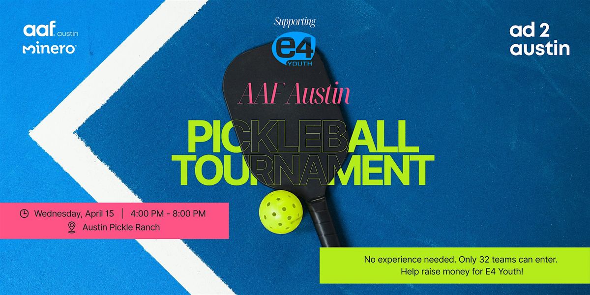 - Format: 32 teams (64 players total) - no experience needed, just show up and get teamed up! Professional courts, tournament brackets, awards ceremony, food/beverage with 2 drink tickets per person, custom swag (paddles/koozies), and networking with AAF Austin's creative community.