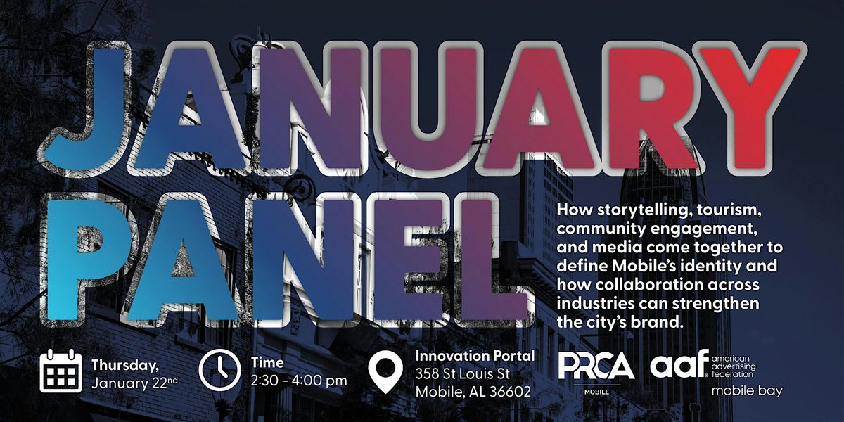 Join AAF Mobile Bay and PRCA Mobile on January 22nd at Innovation Portal for a thought-provoking panel and networking happy hour exploring βWho is Mobile? Branding and Marketing Identity of Our City.β