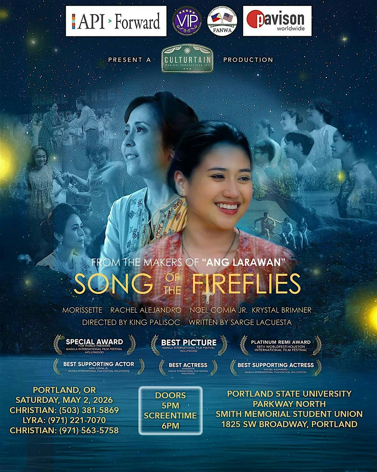 Come join us in person to celebrate AANHPI Heritage Month with a special screening of "Song of the Fireflies." Directed by King Palisoc, the movie follows the origin story of the Loboc Children's Choir and how through their almost magical singing talent and the sheer determination of their teacher/founder from the 1980s to this day, continues to wow the world and bring pride and honor to the Philippines.