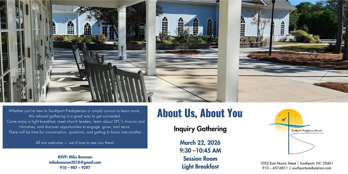 Curious about Southport Presbyterian Church or looking to get more connected? Join us on March 22 from 9:30-10:45 am for a relaxed gathering with light breakfast, conversation, and a chance to learn more about SPC’s mission and ministries. All are welcome—we’d love to see you there!