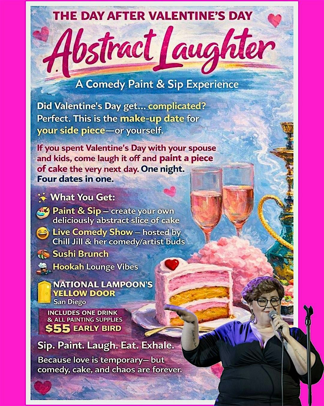 Sip. Paint. Laugh. Eat. Exhale. Because love is temporary—but comedy, cake, and chaos are forever.
