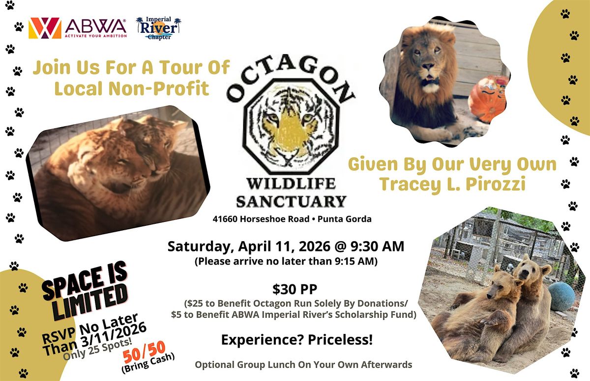 Take a walk on the “wild side”, with your tour guide and ABWA Member, Tracey L. Pirozzi, where she will introduce you to lions, tigers, bears (Oh My!), hyenas, primates, and so many more! Hear the stories of each individual animal while witnessing their natural behaviors as you see them from 6 feet away.