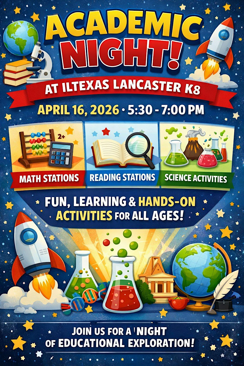Join us for an exciting Academic Night at ILTexas Lancaster K8! Families are invited to explore interactive learning stations and experience the engaging academic programs our students enjoy every day.