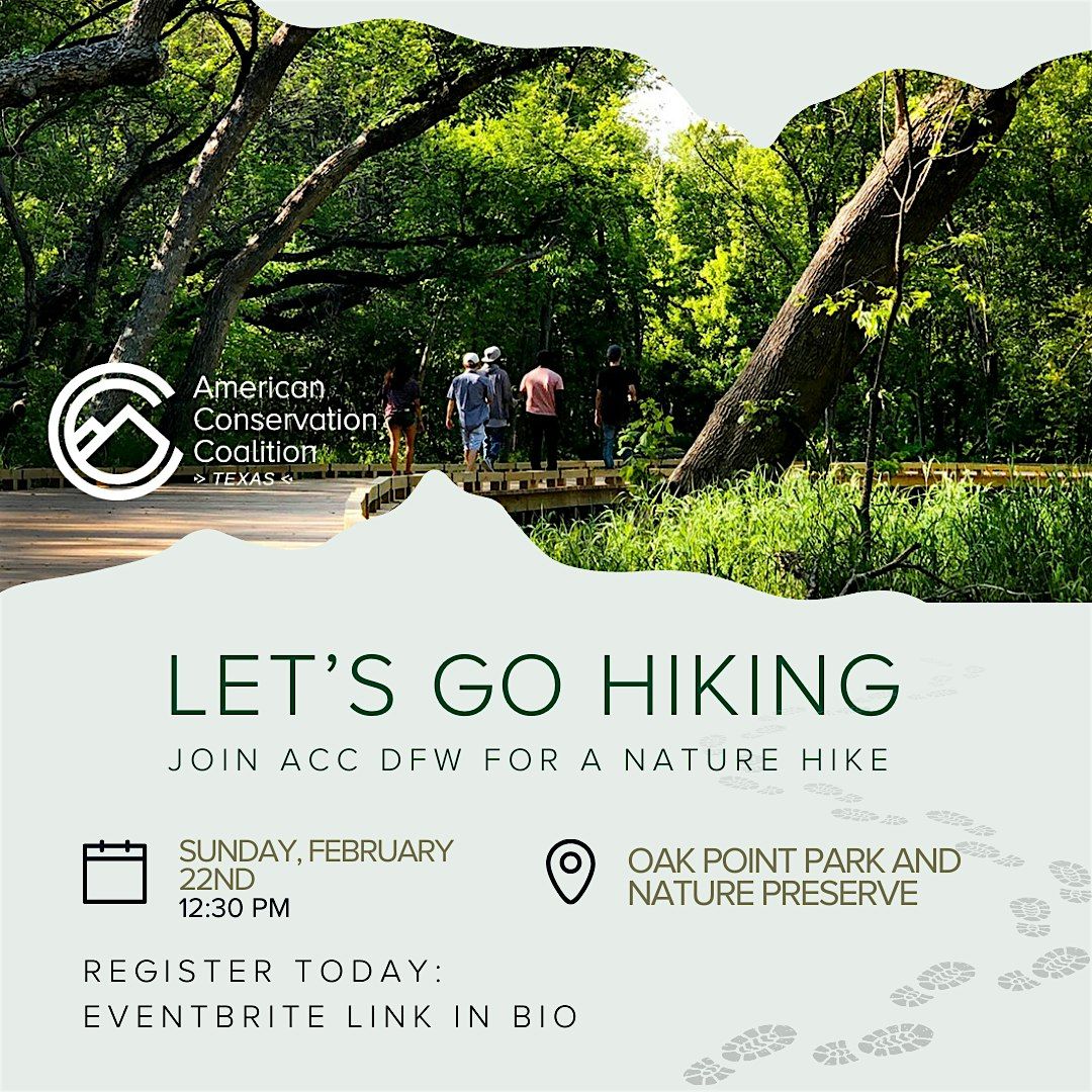 Join us for a low-intensity group hike at Oak Point Park on Feb 22 at 12:30pm. About 4 miles of shaded trail, all welcome!