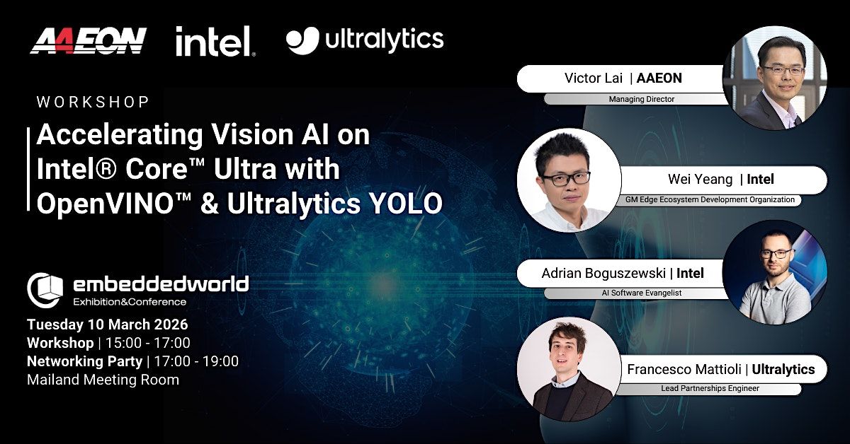 Join AAEON, Intel, and Ultralytics for a technical workshop featuring a live demonstration of how to deploy and accelerate real-time computer vision workloads on Intel® Core™ Ultra Series 3 (code name: Panther Lake) using the Intel® OpenVINO™ Toolkit, and Ultralytics YOLO, and AAEON Edge AI Platforms.