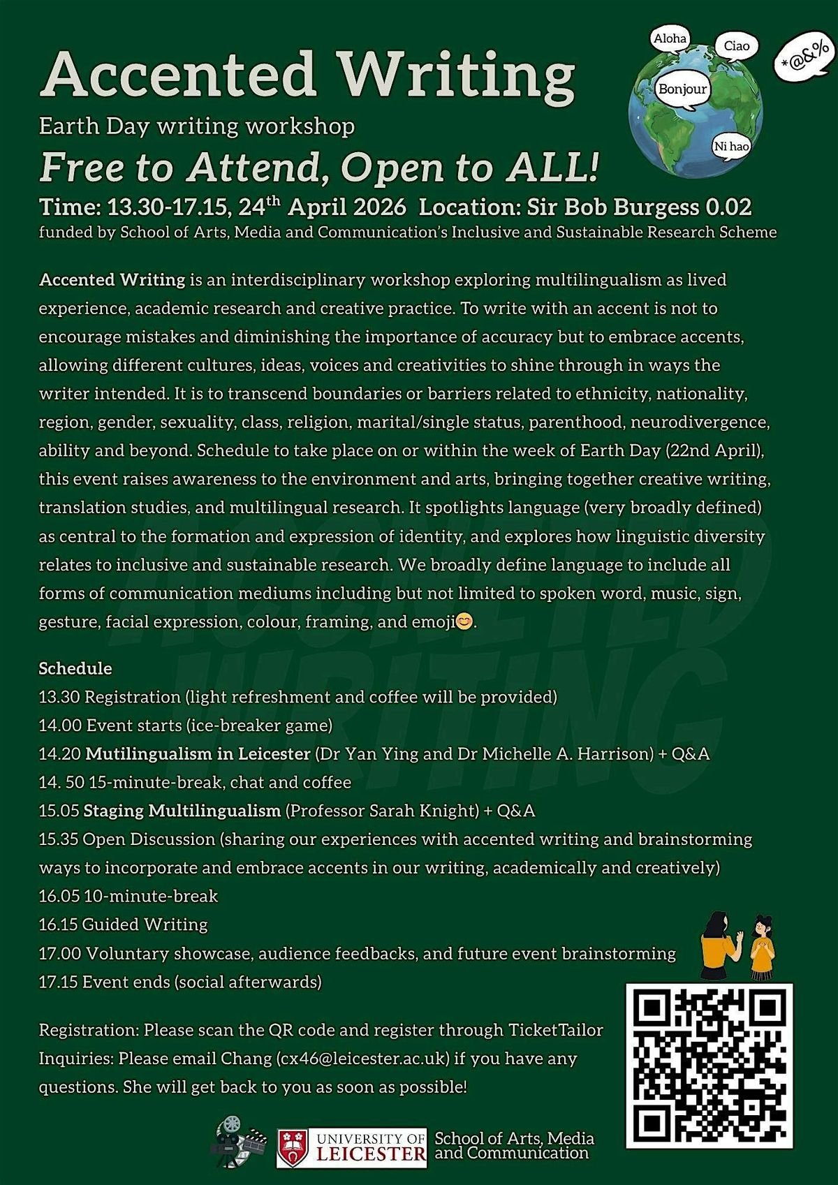 Accented Writing is an interdisciplinary workshop exploring multilingualism as lived experience, academic research and creative practice. To write with an accent is not to encourage mistakes and diminishing the importance of accuracy but to embrace accents, allowing different cultures, ideas, voices and creativities to shine through in ways the writer intended. It is to transcend boundaries or barriers related to ethnicity, nationality, gender, sexuality, class, marital/single status, parenthood, neurodivergence, ability and beyond. Schedule to take place on or within the week of Earth Day (22nd April), this event not only raises awareness to the environment and arts but also brings together creative writing, translation studies, and multilingual research to examine how linguistic diversity relates to inclusive, engaging and sustainable research. It adopts an intersectional framework that understands language (very broadly defined) as central to the formation and expression of identity. This event is Free to attend and open to all. Distance learning students would have the option to join the talks virtually.