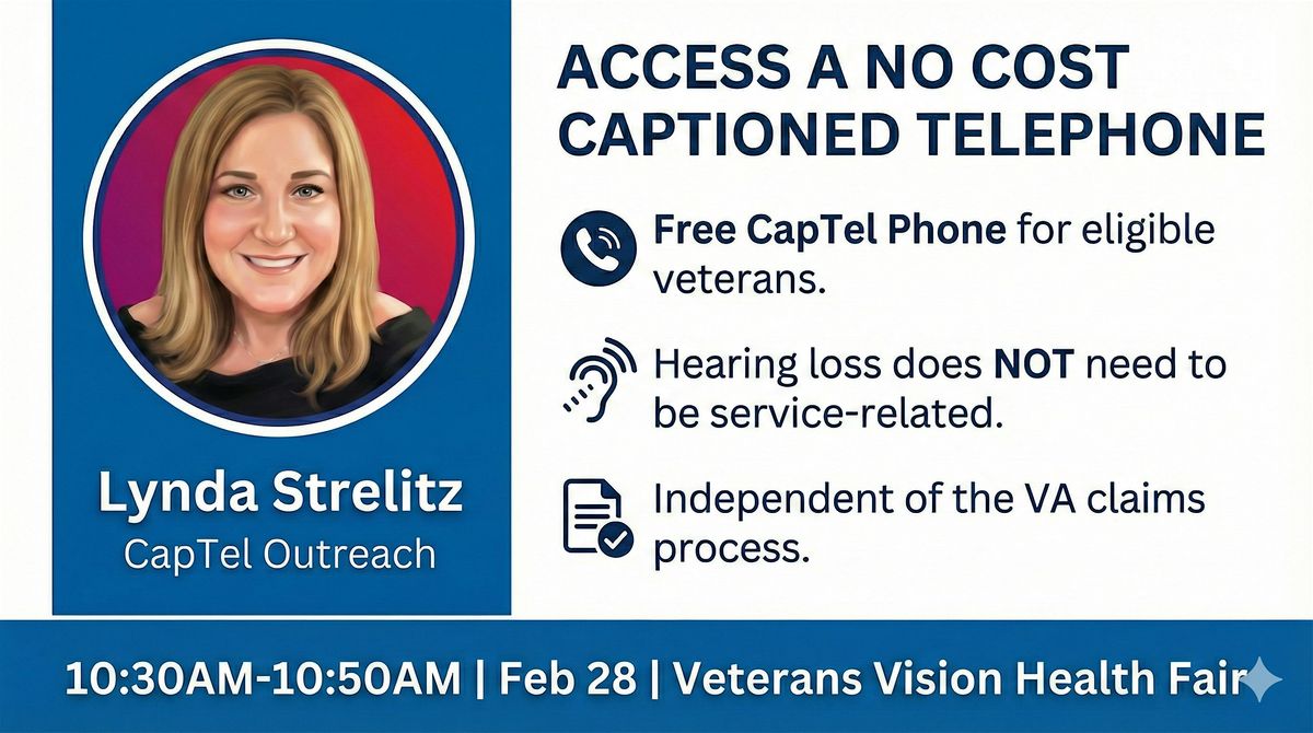 About the Speaker & Program: Lynda Strelitz represents CapTel Outreach and the Heroes With Hearing Loss® program. Their mission is to provide accessible, high-quality captioned telecommunications so that no veteran is left isolated by hearing challenges.