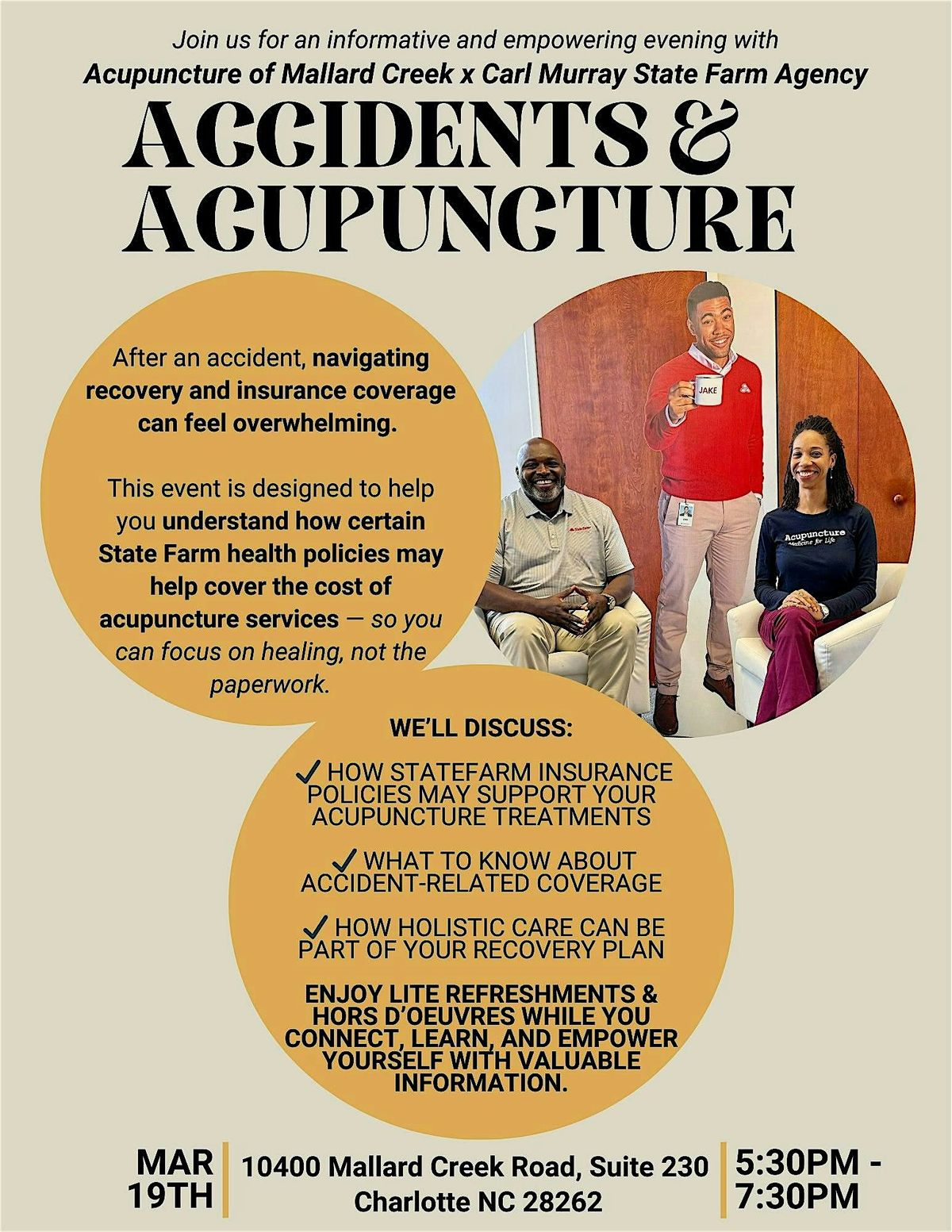 After an accident, navigating recovery and insurance coverage can feel overwhelming. This event is designed to help you understand how certain State Farm health policies may help cover the cost of acupuncture services — so you can focus on healing, not the paperwork.
