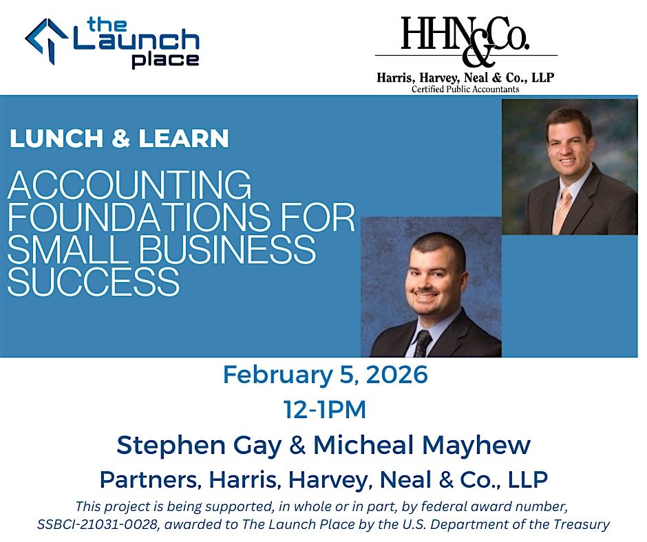 Accounting Foundations for Small Business Success is your guide to setting up your business on solid financial footing. TLP invites you to a no cost Lunch and Learn facilitated by Harris, Harvey, Neal & Co., LLP CPAs, Stephen Gay and Michael Mayhew, on Thursday, February 5th, from 12-1pm at The Launch Place.