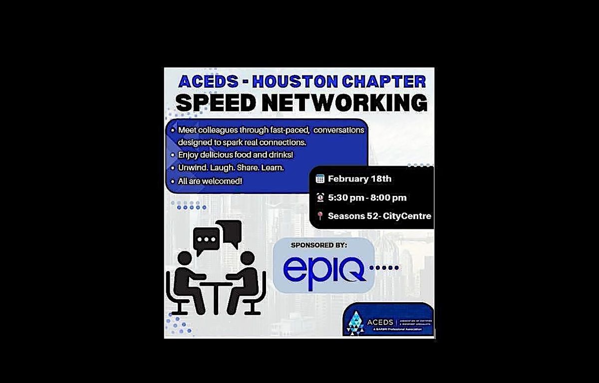 Join the Houston Chapter of ACEDS on February 18th for a dynamic speed networking event designed to bring legal tech professionals together. Through short, structured conversation rounds, you’ll have the opportunity to meet new peers, exchange ideas, and expand your professional network in a relaxed, engaging setting.