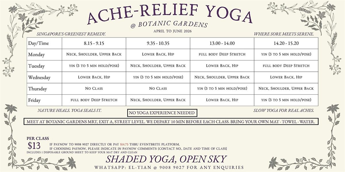 Ache-Relief Yoga @ Botanic Gardens Slow yoga for real aches. No experience needed.