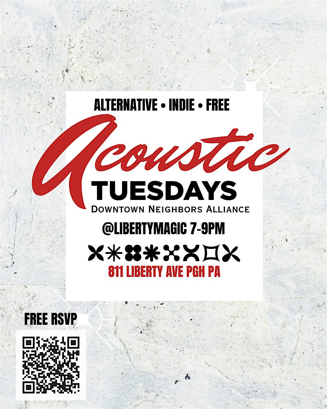 Join the Downtown Neighbors Alliance (DNA) for Acoustic Tuesdays on Tuesday, April 7, from 7:00 PM - 9:00 PM. Experience the soulful, unplugged sounds of Samantha Sears and Josh Gerba in the unique, immersive atmosphere of Liberty Magic.