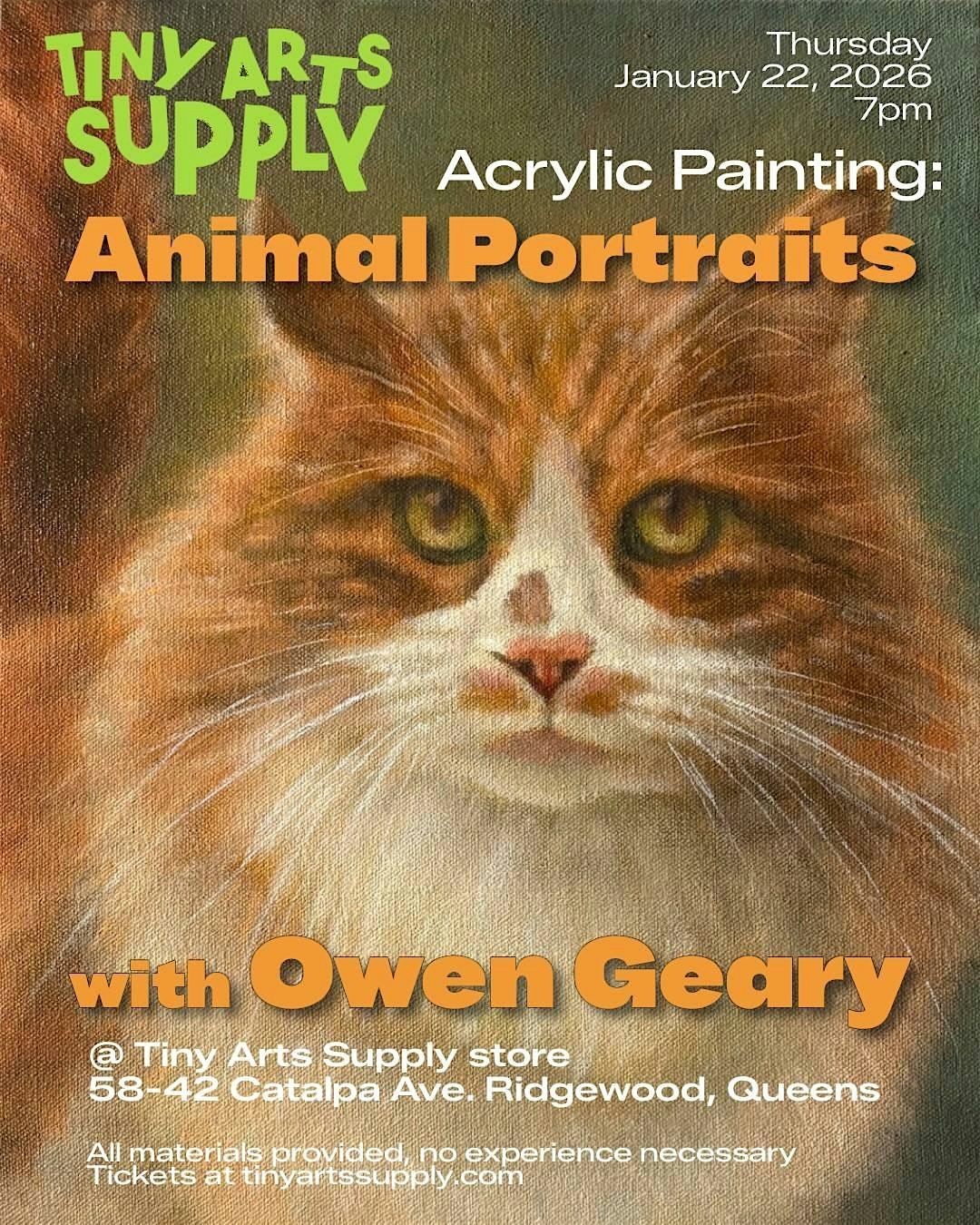 Join Tiny Arts Supply for a hands-on acrylic painting workshop led by Ridgewood artist Owen Geary. Youβll learn core acrylic techniques and create your own animal portrait on canvas.