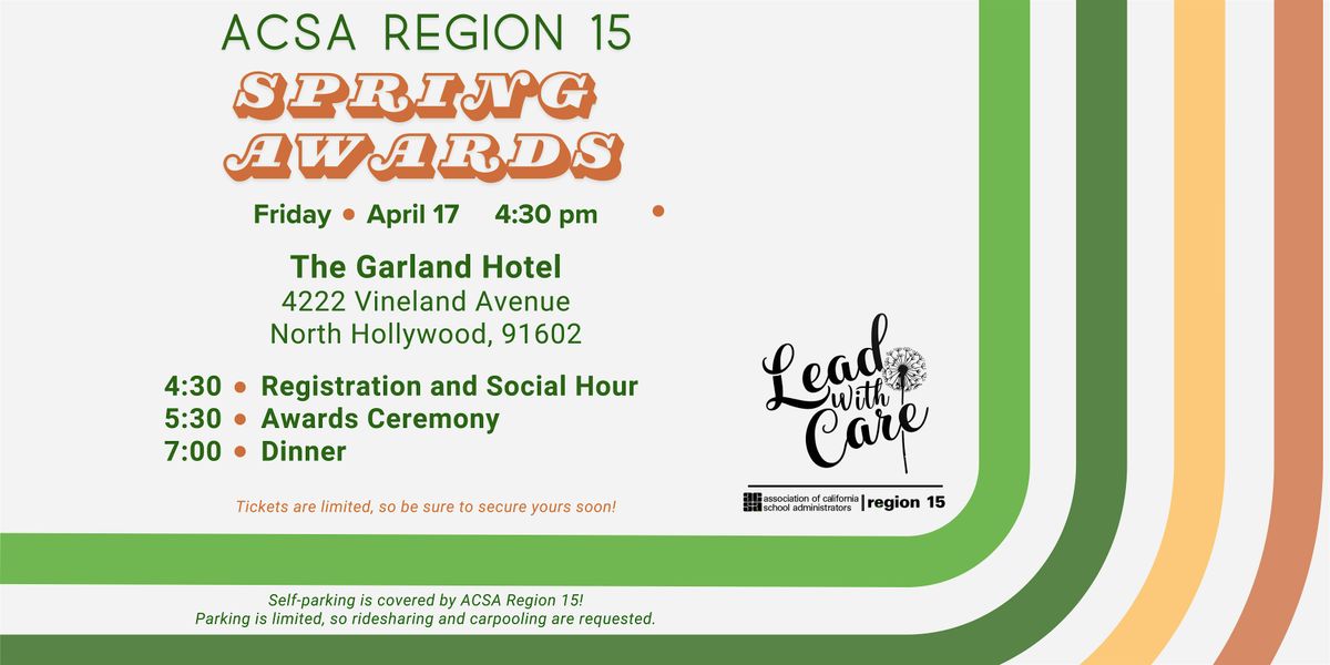 Welcome to the ACSA Region 15 Spring Awards ceremony at The Garland! Get ready to celebrate excellence in education on April 17, 2026 at 4:30 pm. Registration and social hour will start at 4:30, awards will be given at 5:30, and dinner will follow at 7:00. Let's honor the outstanding achievements of educators and leaders in our region. Self-parking is covered by ACSA Region 15. Parking is limited, so ridesharing and carpooling are requested.