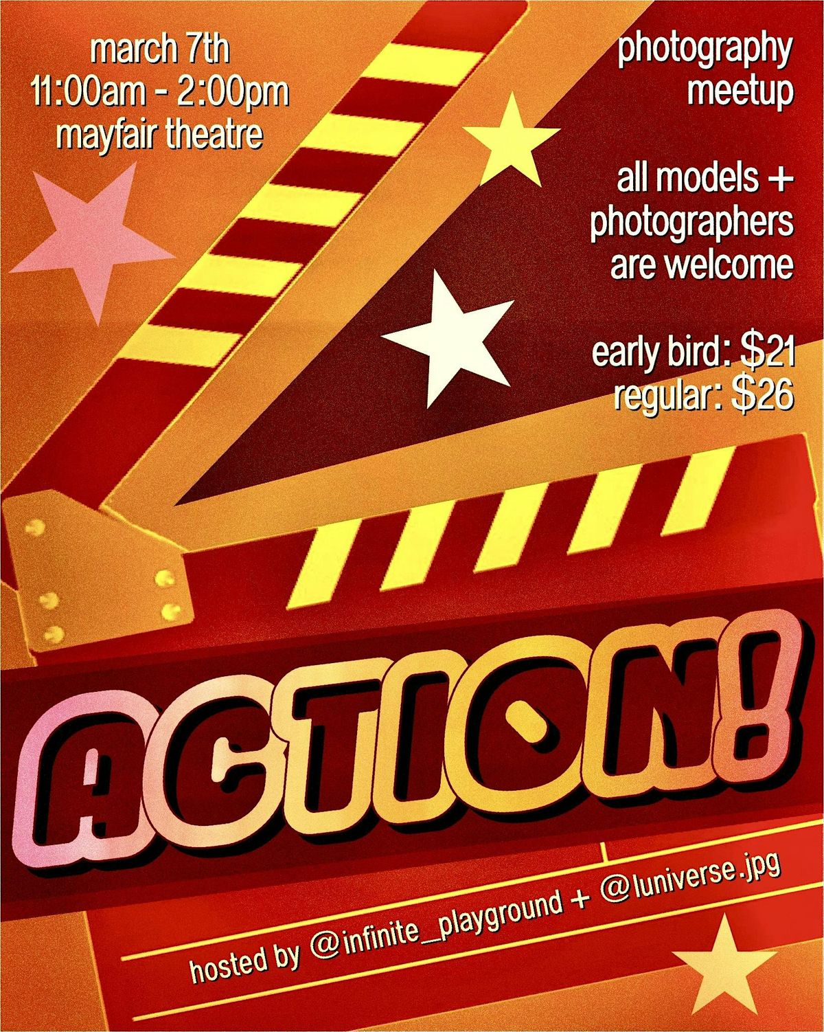 🎟️ March is the month of the Oscars, so I thought it would be fun to do a movie-themed photo meetup! We’re inviting all photographers, creatives and models, from beginners to pros, to join us for the next meetup happening on March 7th from 11:00 AM to 2:00 PM.