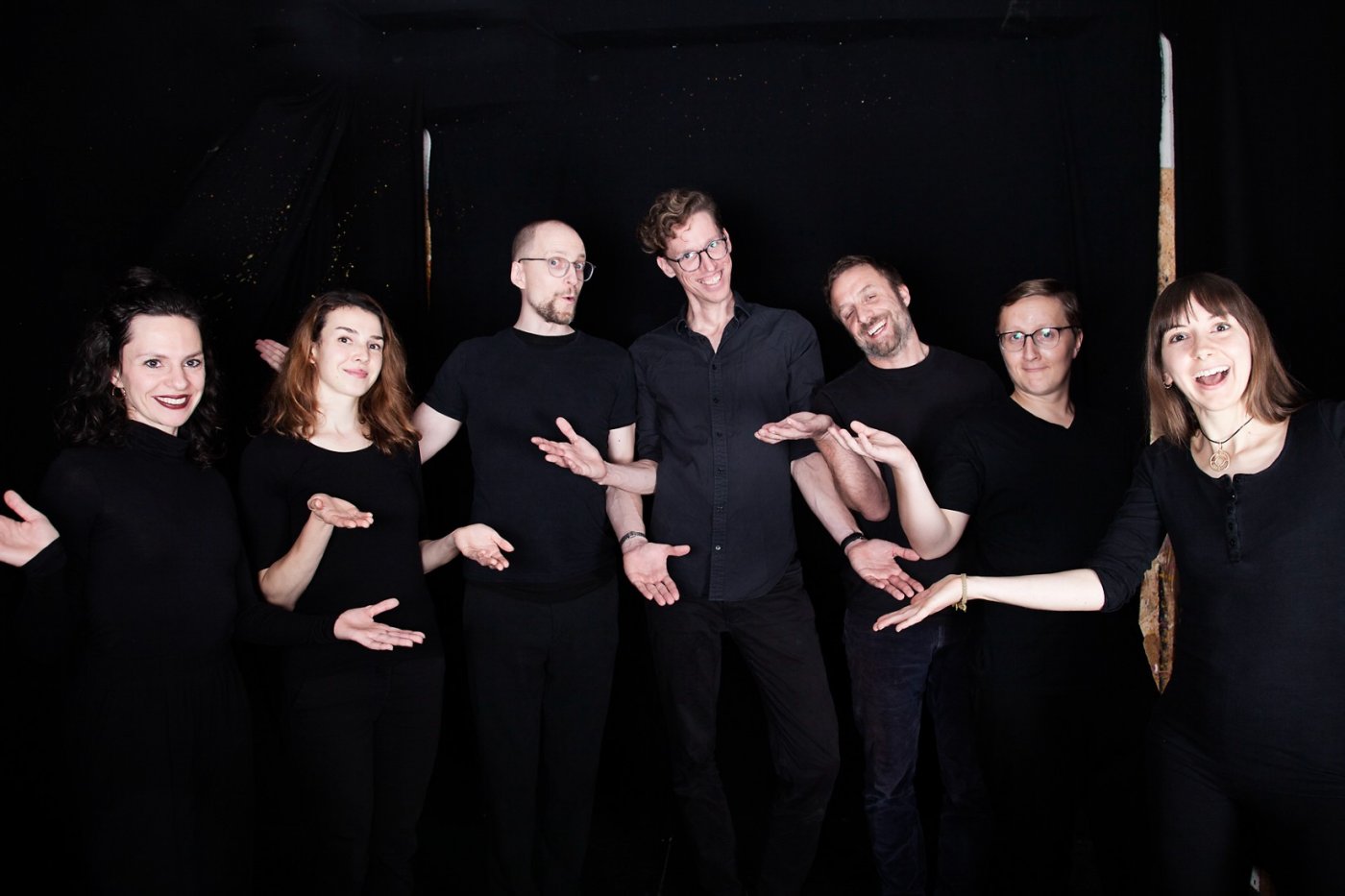 Unsere Impro-Shows bestehen immer aus zwei Halbzeiten: In der ersten zeigen wir dem Publikum ein Langform-Format. Das bedeutet, es gibt einen Reigen von Szenen, der auf irgendeine Weise miteinander zusammenhängt. Mal über ein Thema, zu dem ihr uns inspiriert habt. Mal über eine Geschichte, die sich durchzieht. Mal Figuren, die wieder auftauchen. Gemeinsam ist allen Langformen, dass sie Raum für die ganze Bandbreite des Erzählens lassen: atemlose Schnelligkeit genauso wie ruhigen Tiefgang, absurd Komisches genauso wie überraschend Berührendes. Weil es beim Improtheater keinen vorher festgelegten Plan gibt, kann alles passieren.