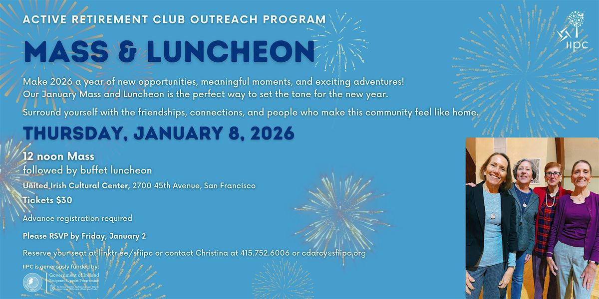 Join us for our fun and festive holiday extravaganza Mass and Luncheon, which will take place on Thursday, January 8, 2026, at the United Irish Cultural Center, beginning at 12:00 p.m.