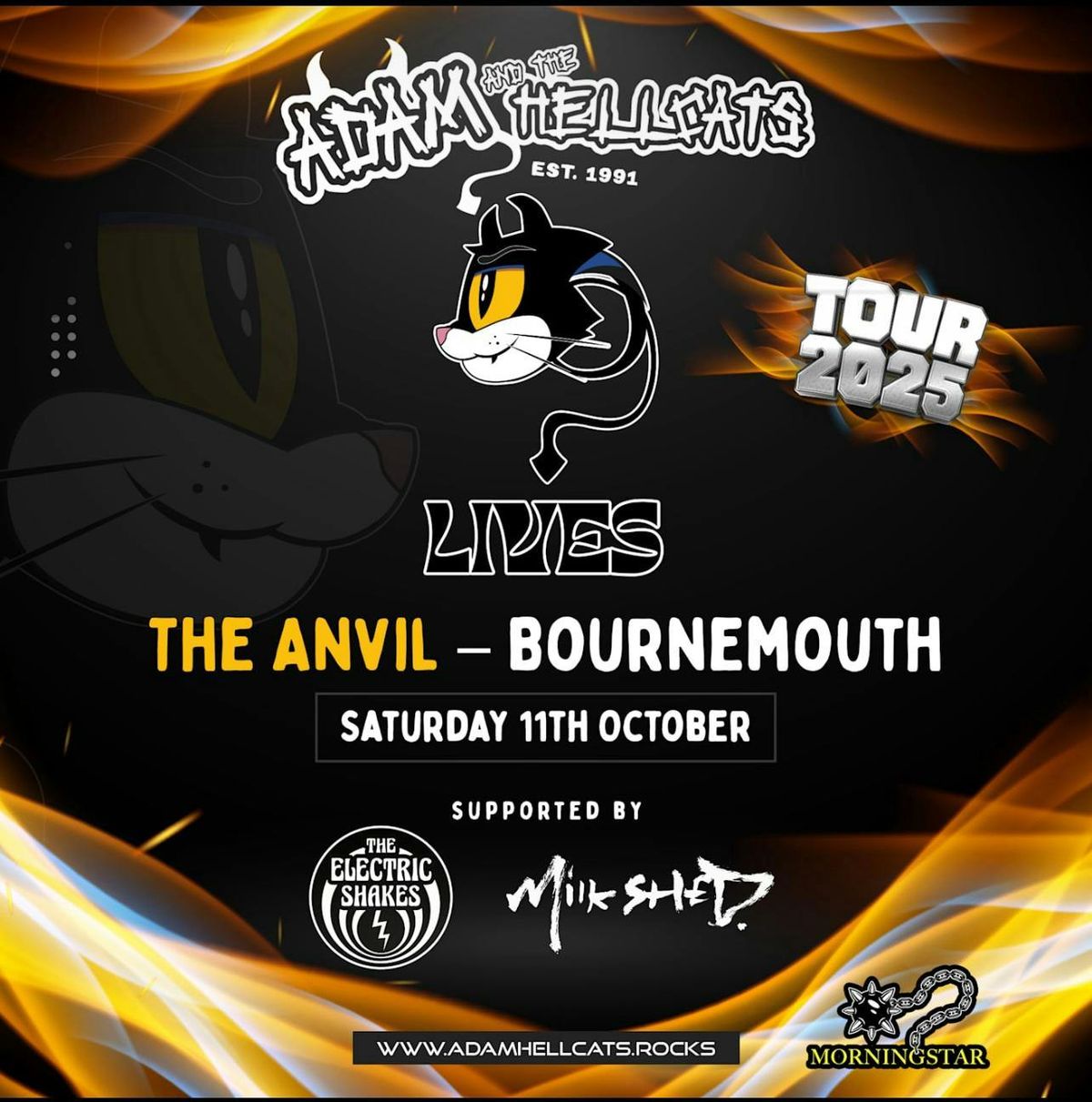 ADAM AND THE HELLCATS are an unstoppable six-piece rock ‘n’ roll band from Bristol. The powerhouse act will releasetheir eagerly awaited third album, 9 Lives, on Friday 3rd October. In the lead-up to the album, the band will unveil theiremotional new single and video, Go Easy, which lands on all platforms on Friday 1st August.The Hellcats have carved out a fierce reputation on the UK rock circuit, earning their stripes by touring and supportinga host of established acts. They hit the road as special guests of Jackie Chambers (Girlschool) with her band, Syteria,and opened the first night of The Wildhearts’ UK Tour. Since then, they’ve toured with U.S. rock heavyweights, Hearts& Hand Grenades, and rising UK favourites White Raven Down.Their festival presence has been just as commanding, with high-energy sets atStation 18, Dementia Aware Fest, Crazy Cowboy Festival, Rockin’ by the River,and many more. In November 2024, they headlined the second stage at theprestigious HRH Festival in Great Yarmouth to a packed crowd. That buzzsecured them a slot at HRH Road Trip Ibiza 2025, where they opened thefestival for none other than Phil Campbell and the Bastard Sons.Founded by frontman and guitarist Adam Feasey, the band features two leadvocalists — Adam and the formidable Cirwen Costa — bringing power,versatility, and emotional depth to their sound, which is made even moredistinctive by the inclusion of a keytar, adding flair and rich texture to their explosive live performances.Their upcoming album, 9 Lives, marks a deeply personal milestone for the band. “It’s a real coming-of-age record forus.” says Adam. “The songwriting is more mature than anything we’ve done before. Honestly, this album is absolutelyour best work yet. I know every band says that — but being autistic makes me a crap liar, so I genuinely believe it!”With 9 Lives, ADAM AND THE HELLCATS are stepping into their prime. Whether tearing up a festival stage or droppinganthems built to last, they’re bold, unforgettable, and ready to make every one of their nine lives count.Support comes from local legends The Electric Shakes and the rapid rising Milkshed who performed at Galstonbury this year!