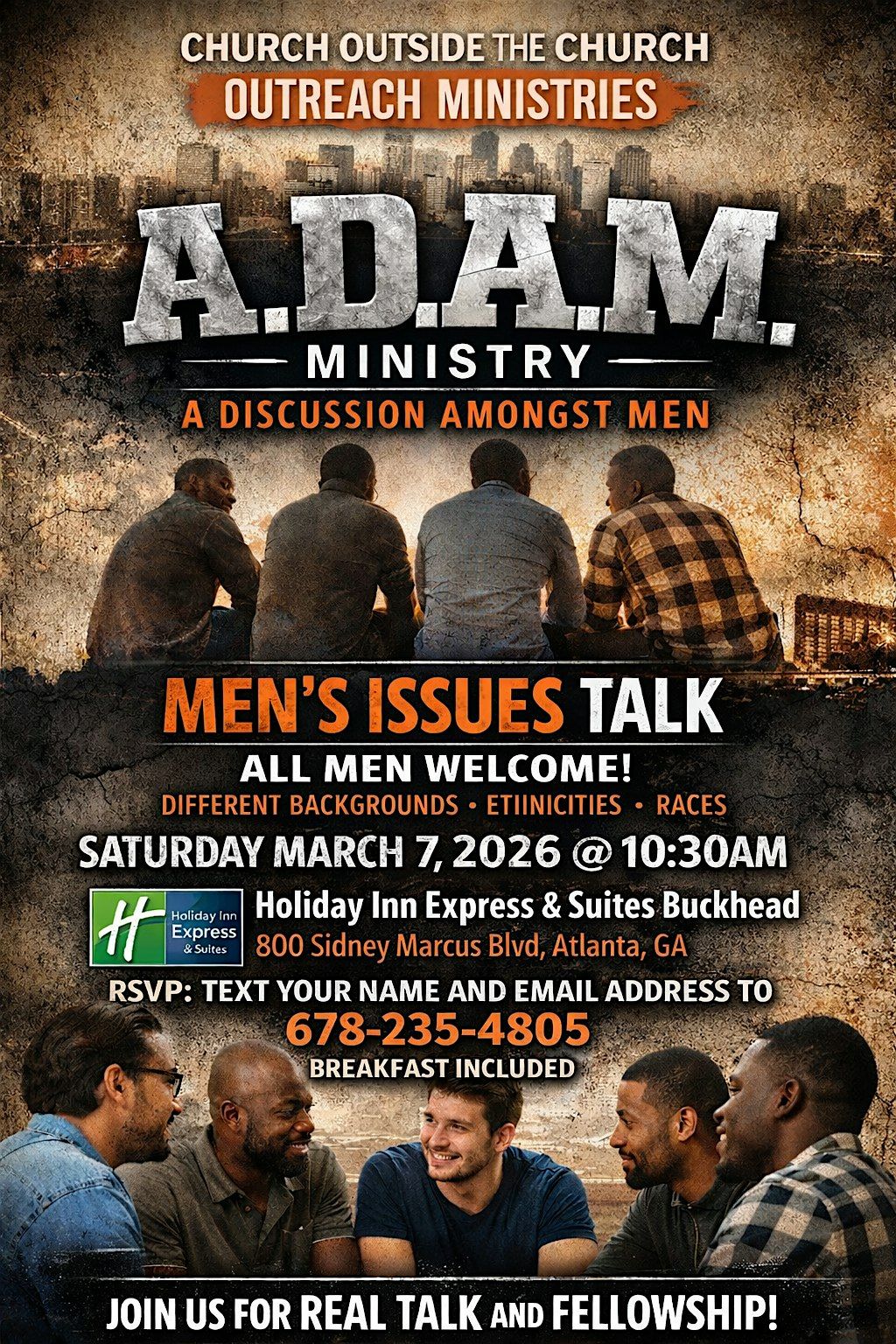Join us for a laid-back and real talk session at 800 Sidney Marcus Blvd NE. It's all about tackling the stuff that matters to men today. Come through on March 7, 2026 at 10:00 AM (Eastern Time) to connect, share, and grow with the crew. Don’t miss out on this chance to be part of something meaningful and chill. Breakfast Included. See you there! RSVP: Text Name & Email to 678-235-4805.