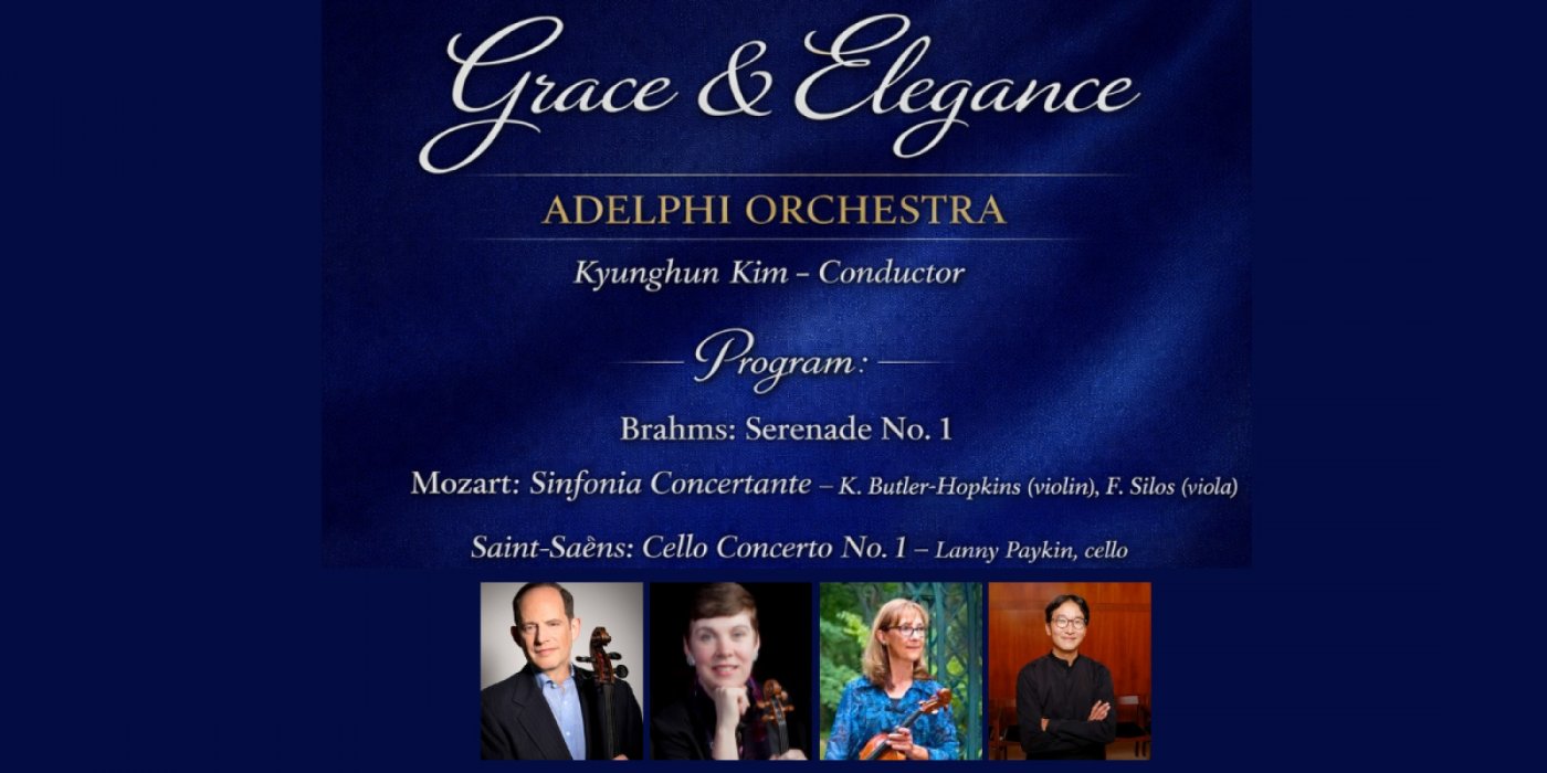 Experience an evening of refinement, lyricism, and orchestral beauty with the Adelphi Orchestra in Grace & Elegance. Under the baton of Principal Conductor Maestro Kyunghun Kim, this concert showcases celebrated soloists and beloved masterworks from the Classical and Romantic repertoire.