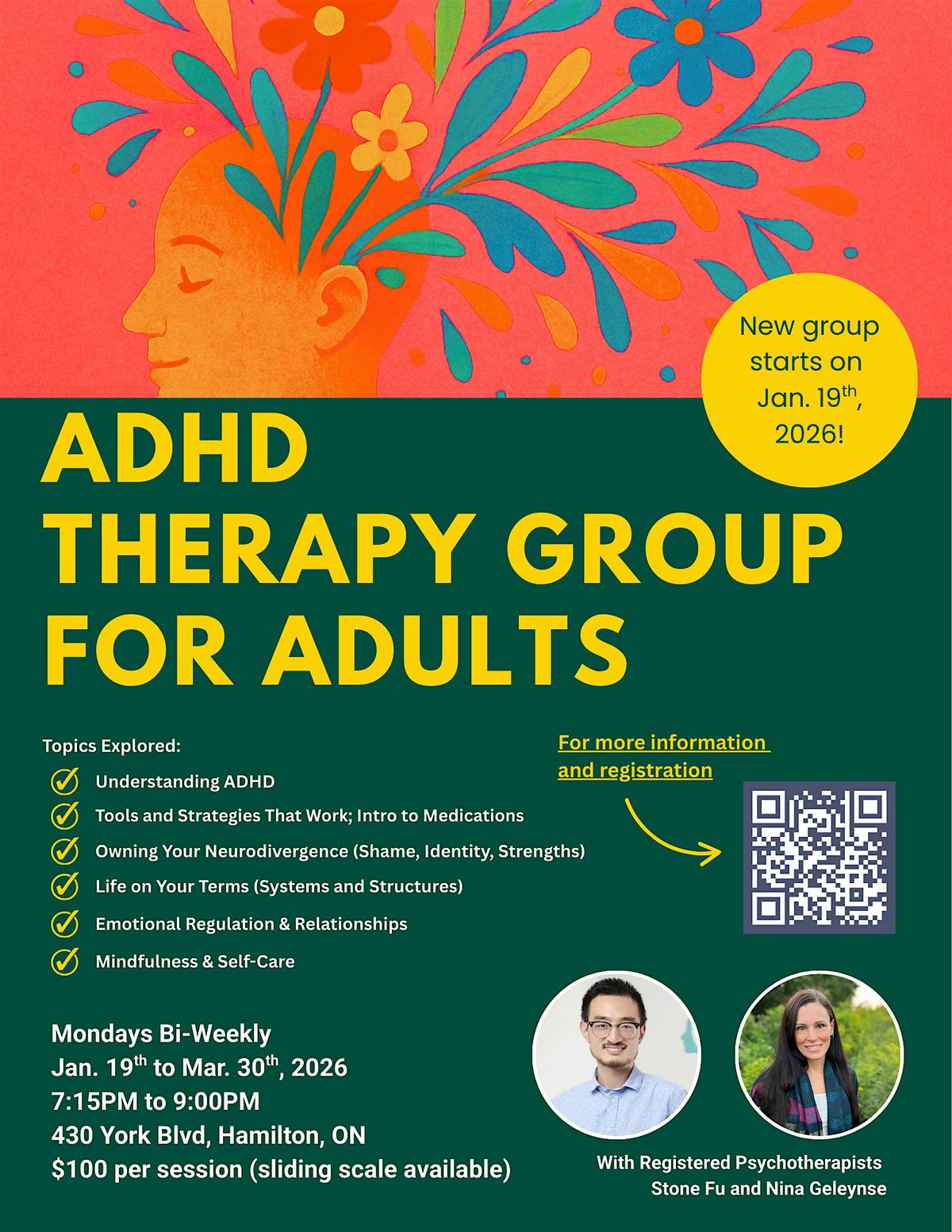 Join us for a 6-session psychotherapy group designed for adults with ADHD (diagnosed or suspected). Together, we’ll explore practical strategies, emotional support, and community connection in a safe and welcoming space. Each session will include a check-in, somatic/mindfulness practice, psychoeducation, and group reflection. this group will be facilitated by psychotherapists Nina Geleynse and Stone Fu - both neurodivergent and deeply passionate about this work.