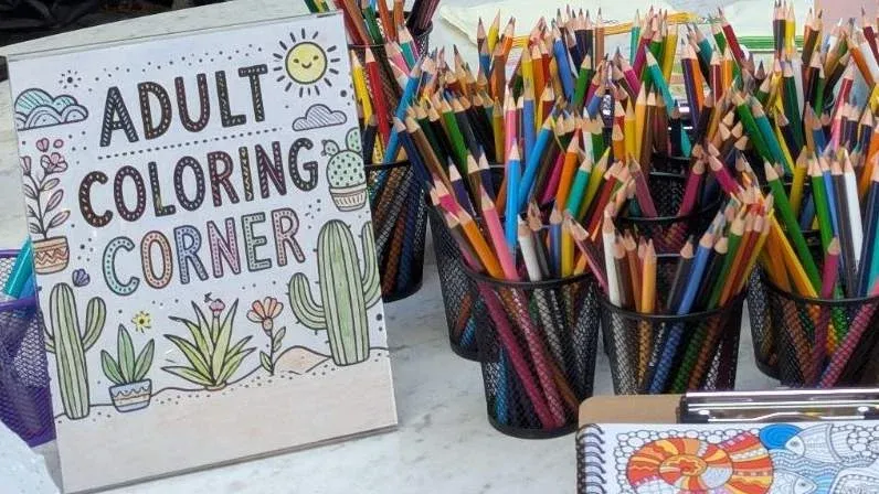 * Supplies: Colored pencils, markers, erasers, coloring book pages, and clipboards provided for shared use. Feel free to bring your own suppliesโno obligation to share.