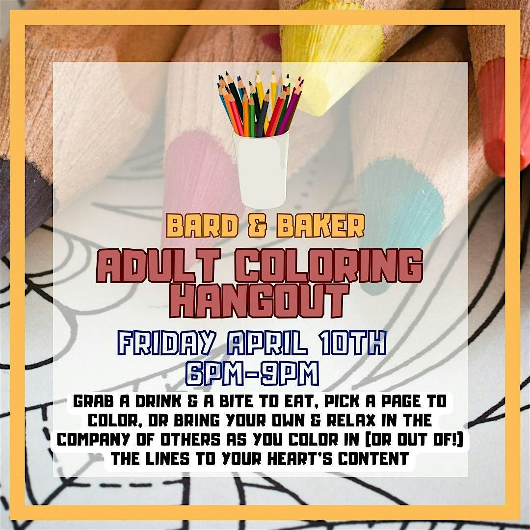 Grab a drink & a bite to eat, pick a page to color, or bring your own & relax in the company of others as you color in (or out of!) the lines to your heart’s content.